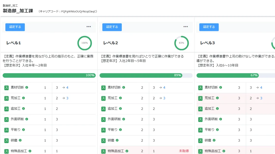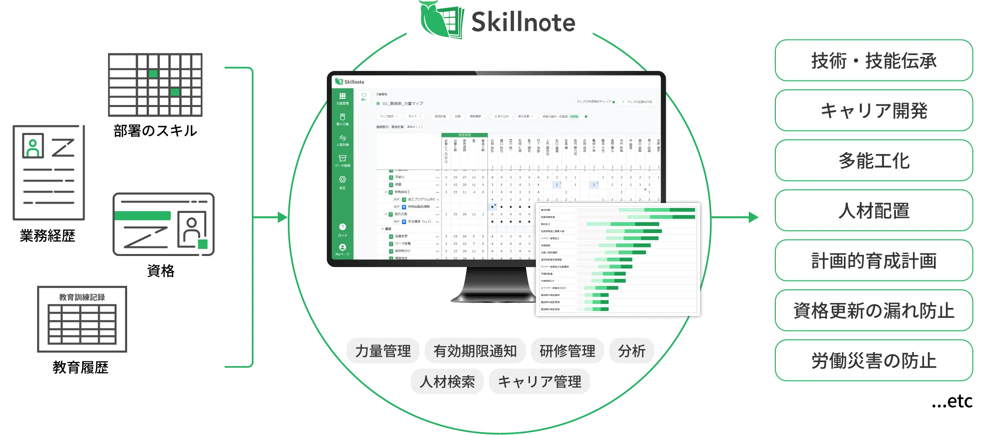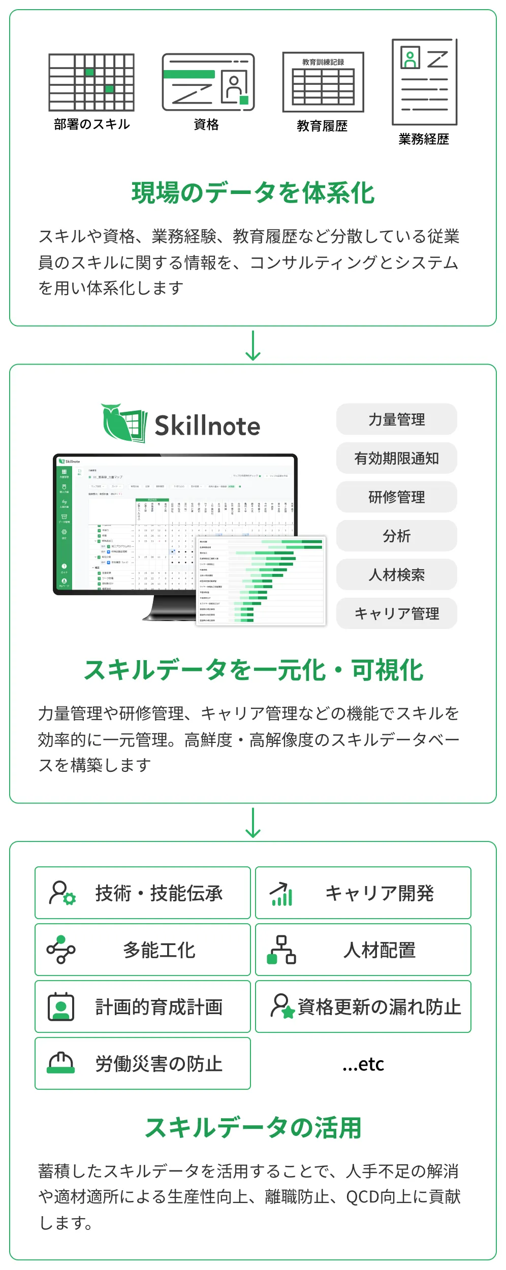 蓄積したスキルデータを活用することで、人手不足の解消や適材適所による生産性向上、離職防止、QCD向上に貢献します。