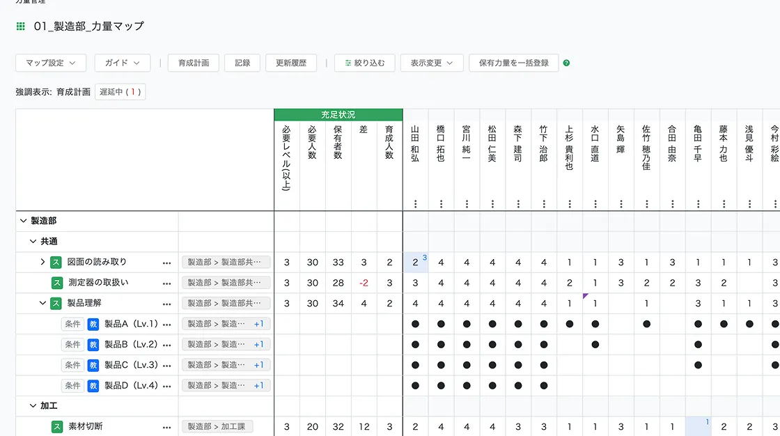 力量管理や研修管理、キャリア管理などの機能でスキルを効率的に一元管理。高鮮度・高解像度のスキルデータベースを構築します。