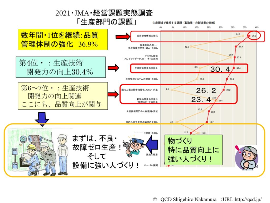 最初の「品質向上戦略展開と成果」に関してですが、これは経営課題としても認識されています。2021年に日本能率協会が実施した調査「経営課題実態調査」では、「生産部門の課題」として「品質管理体制の課題」が第1位(36.9%)に挙げられています。第4位が「生産技術開発力の向上」(30.4%)です。つまり「良いもの作ること」が最大の目的であり、その上で続々と開発される新製品のライフサイクルに対応する「生産技術を高めること」が重要視されていることがわかります。「物づくりに強い人づくり」が製造業共通の経営課題として認識されている、ということです。