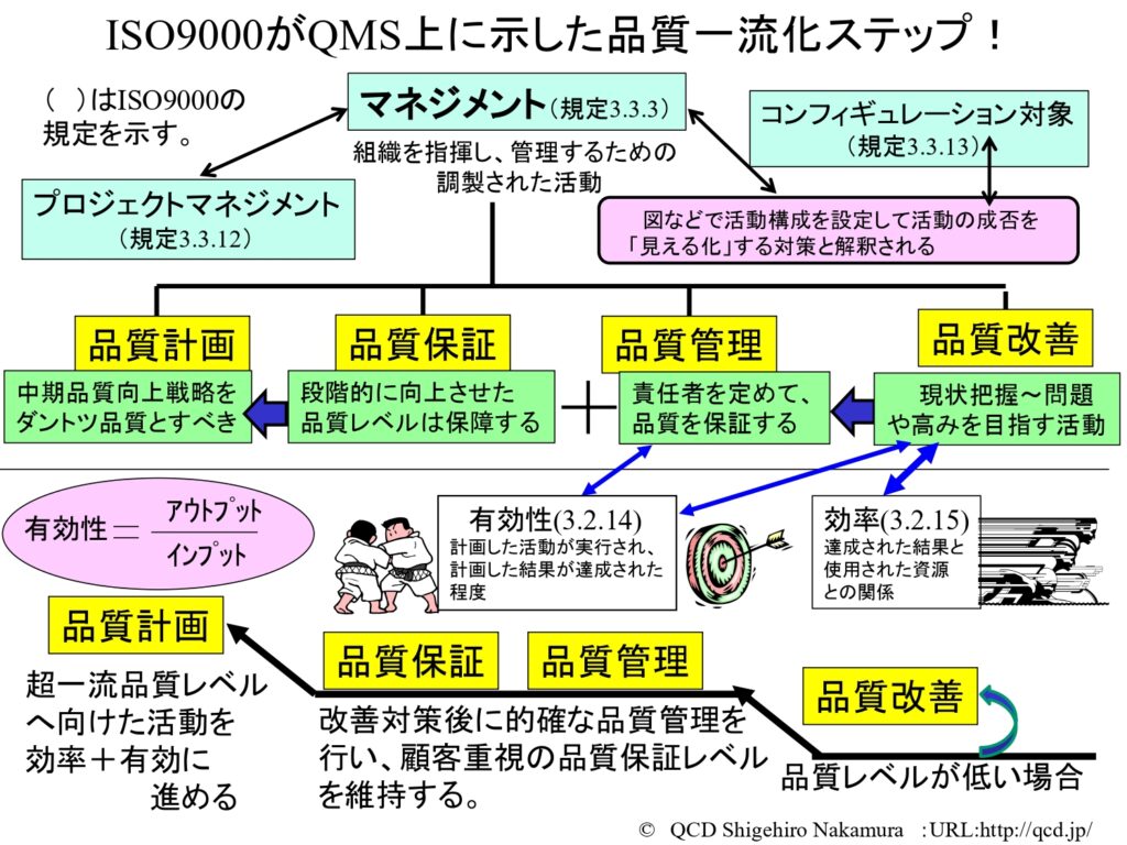 ところで、ISO9000がQMS(品質マネジメントシステム)に示した品質一流化のステップがあります。それは、(1)「品質向上」を図ること、(2)不良品を出さないよう「品質管理」すること、(3)品質レベルを保証すること(「品質保証」)、(4)世界一流のダントツ品質を目指すこと(「品質計画」)です。これら一連のステップにおいてISOが提唱しているのが「有効性と効率」です。つまり、短期間でのスキルアップが求められており、スキルマップを用いた人材育成も「ダントツ品質」を目指すことと不可分である、ということですね。