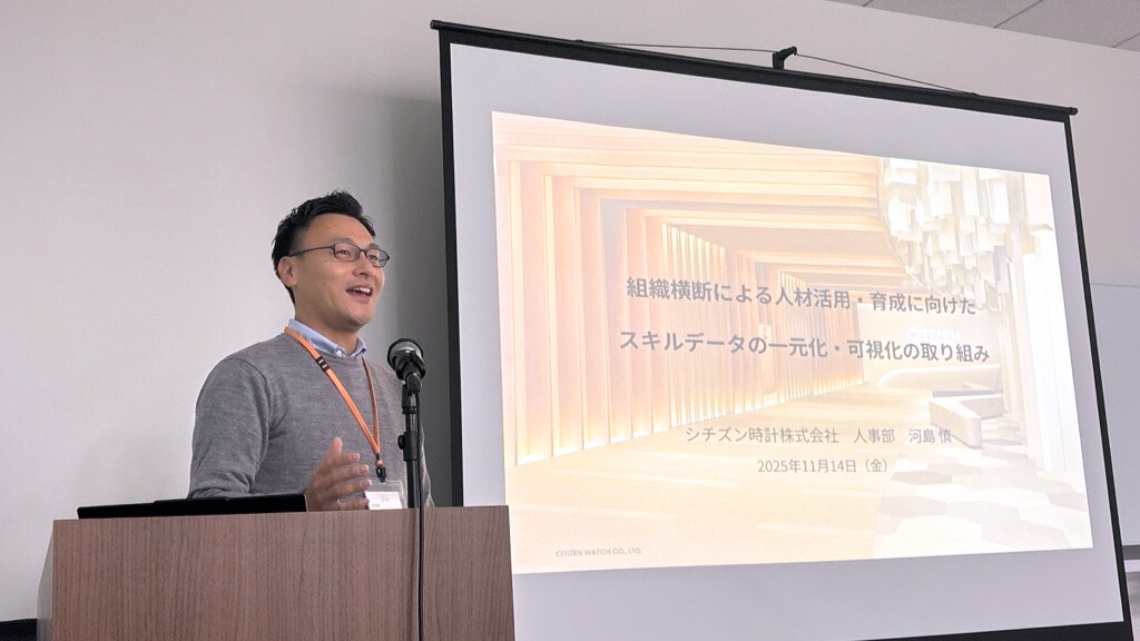 2社目となる「Skillnote」利用企業講演では、シチズン時計株式会社 人事部 人財開発課 主任 河島 慎様がご登壇。同社は、腕時計の部品から完成時計の組み立てまで自社で一貫製造することができる総合時計メーカーです。人的資本経営を掲げ、人財の確保と育成に力を入れるなかで、スキルデータの一元化・可視化を進めています。今回、各事業やグループ会社と連携しながら進めている取り組みについてご紹介いただきました。