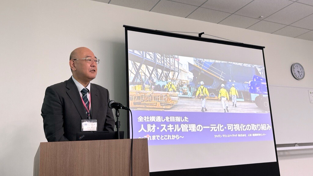 続いて、「Skillnote」利用企業講演として、ジャパン マリンユナイテッド株式会 人財・組織開発センター 主査 鈴木方人様にご登壇いただきました。同社は、100年以上の歴史を持つ4つの会社の造船部門を再編し、2013年に誕生した造船会社で、現在、複数の事業所で「Skillnote」を利用しています。現場で働く作業者のスキル管理の一元化・可視化に取り組まれており、今回、複数拠点におけるスキル管理の工夫や苦労について発表いただきました。