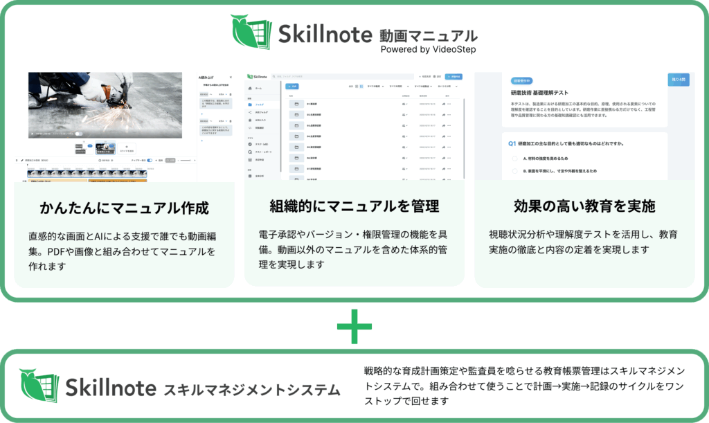 これに伴い、Skillnoteは2026年1月20日より動画マニュアル作成・管理サービス「Skillnote 動画マニュアル Powered by VideoStep」の提供を開始します。本サービスはVideoStepのOEMを受けてSkillnoteが提供するもので、動画を活用した教育の実施と定着を支援します。既存の「Skillnote スキルマネジメントシステム」と併用することで、製造現場における教育計画の策定から動画を活用した教育実施、教育の記録までを包括的な支援が可能になります。