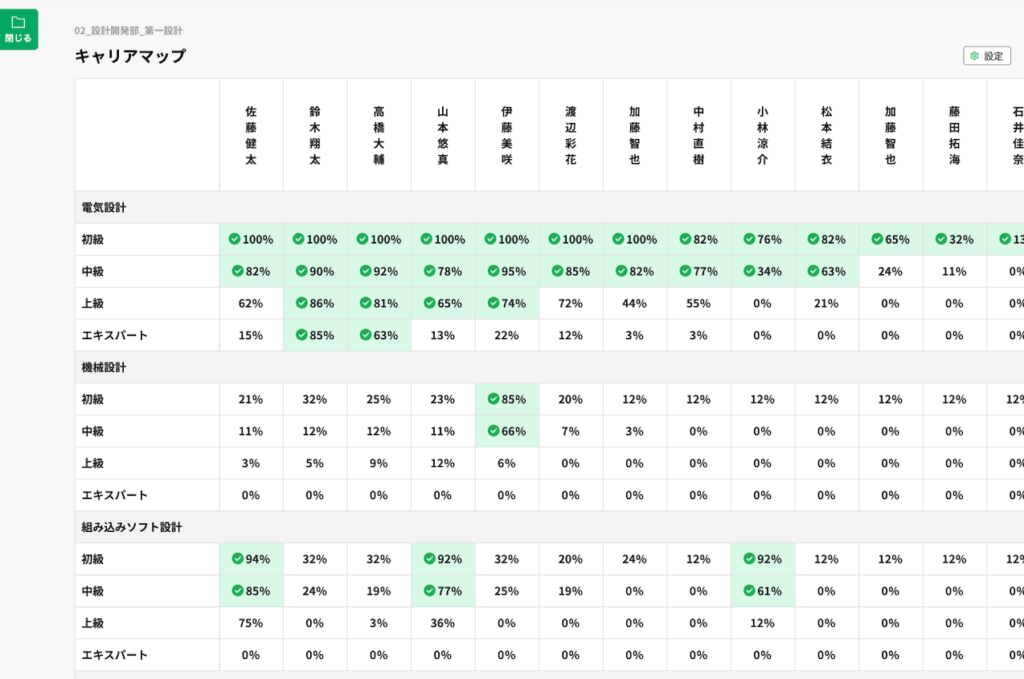 電気設計や機械設計などの職種や職務ごとに「初級→中級→上級→エキスパート」といったステップアップと、各ステップアップに求められるスキルや資格、経験などの要件を設定できます。各従業員がそれらの要件をどの程度充足しているかを、組織全体で一覧化して把握できるため、複数資料の照合や個別確認といった煩雑な作業を省くことができます。