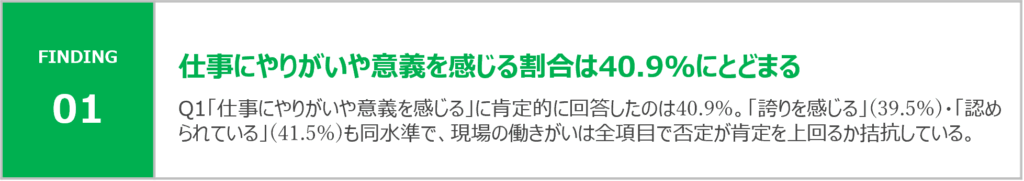 - 「やりがいや意義を感じる」肯定層は約41%に達する一方、「仕事ぶりや努力が認められている」の否定層は約26%存在し、貢献実感と承認実感の間にギャップがある