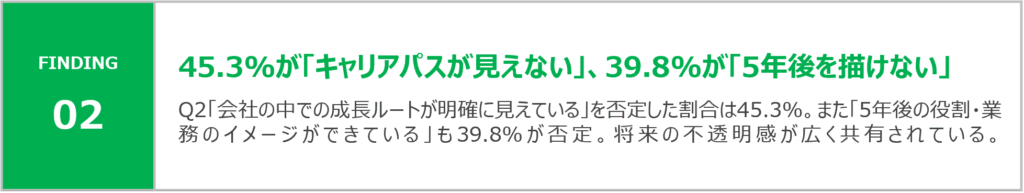 - 「仕事に対するモチベーションは高い」の否定層が36.2%に達し、キャリアの見通しの不透明さがエンゲージメント低下に直結していることが示唆される