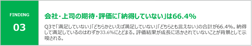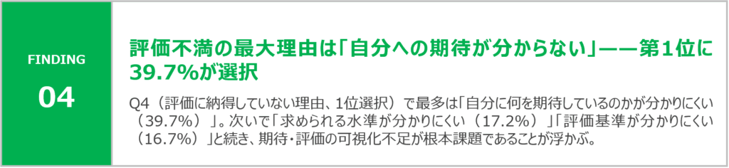 - 「どちらとも言えない」が30.1%と最多層であり、納得も不満もできない「評価の曖昧な宙吊り状態」に多くの社員が置かれている