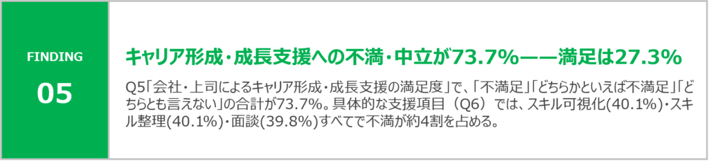 - 1位期待:定期的なキャリア・期待に関する面談(30.4%) → Q6の実施実感との乖離が最も大きい施策
