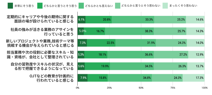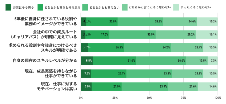 - 「自身の現在のスキルレベルが分かる」は肯定40.4%と相対的に高いが、「会社の中での成長ルート(キャリアパス)が明確に見えている」は否定が45.3%と突出して高い
