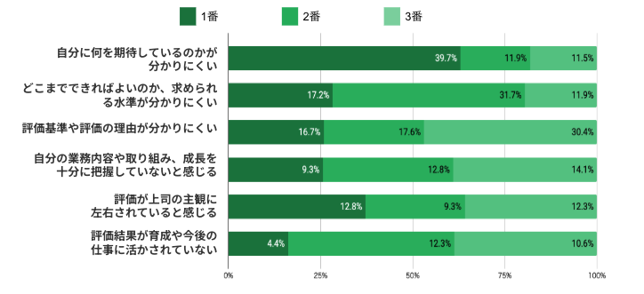 - 「求められる水準が分かりにくい」「評価基準・理由が分かりにくい」が続き、評価の透明性・言語化の欠如が共通課題として浮かび上がる