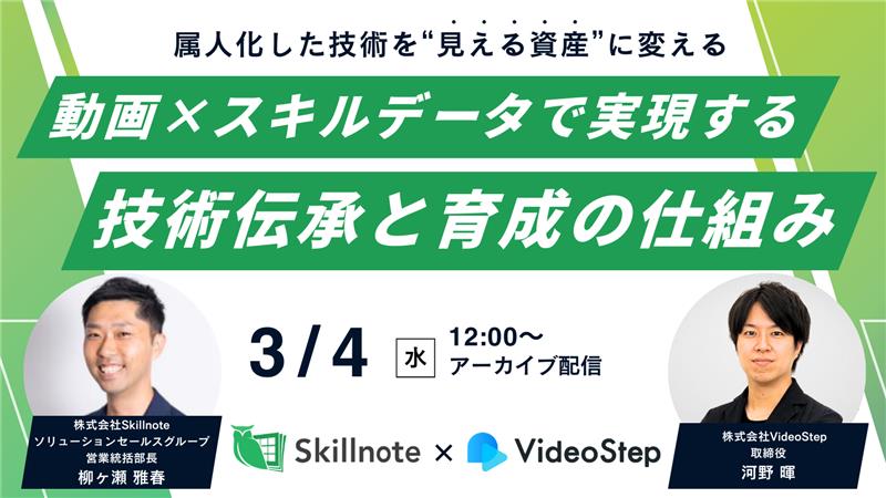 ● 受付中オンライン配信複数日開催2026年3月4日(水) 12:00〜他~属人化した技術を“見える資産”に変える~ 動画×スキルデータで実現する技術伝承と育成の仕組み