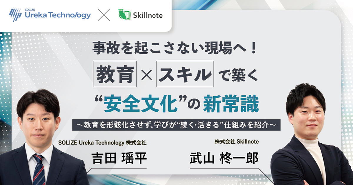 SOLIZE Ureka Technologyより、AIを活用した事故防止に直結する安全教育の最新事例を、Skillnoteからは教育履歴や習熟度を可視化し、教育を単発で終わらせず現場に定着させる仕組みを紹介。