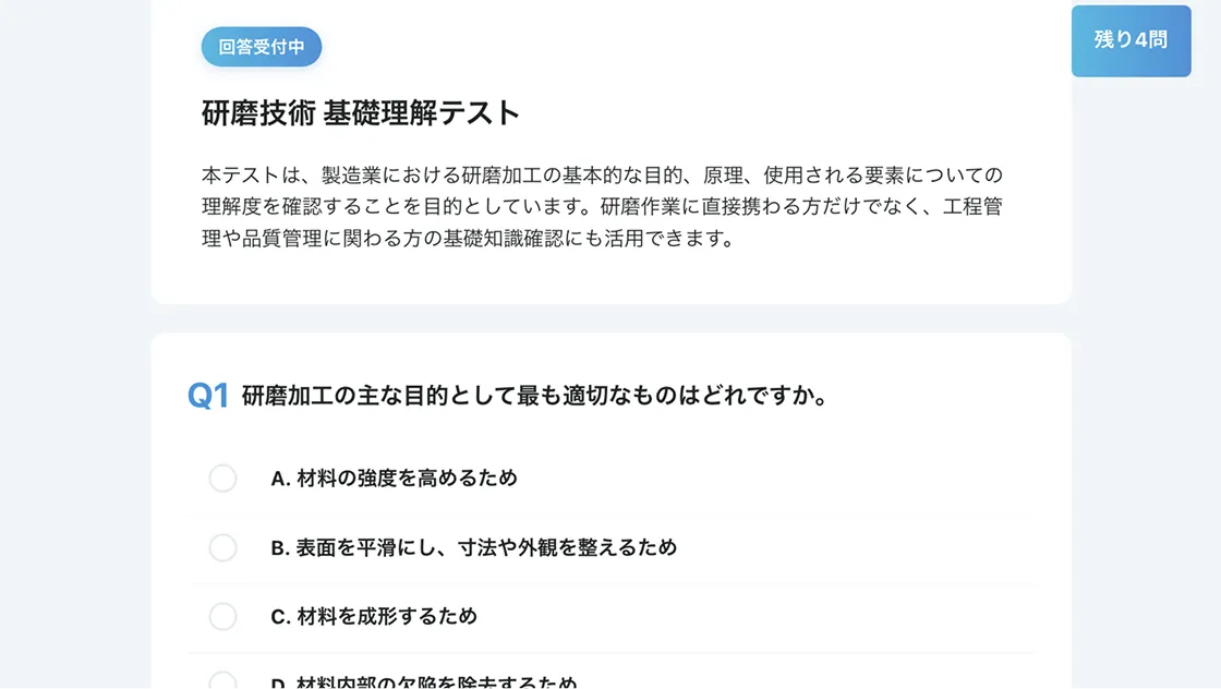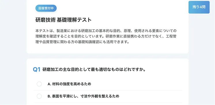 設問内容を組み合わせ、自由にテストを作成。受検後は全員の回答をCSVでダウンロードできるほか、自動採点もできます。