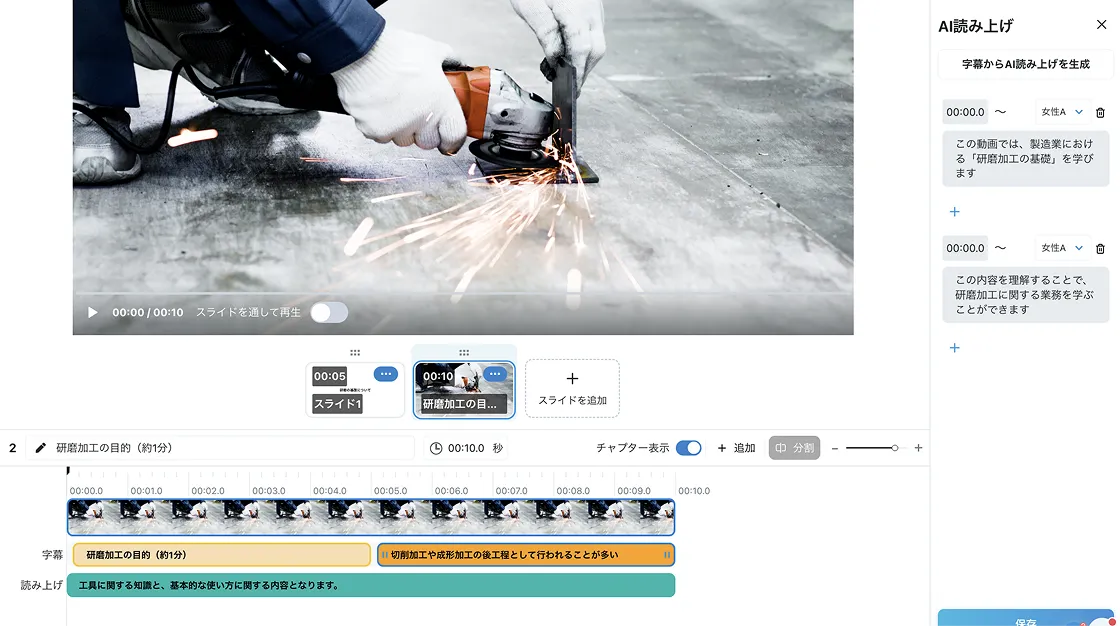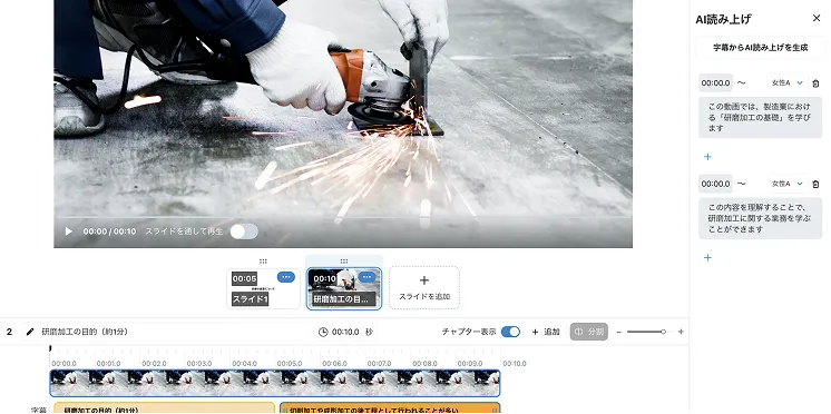 パワポのスライド感覚で手順ごとに動画を編集、ナレーションや字幕もAIで自動作成。PDFや画像を動画内に差し込みことも自在にできます。