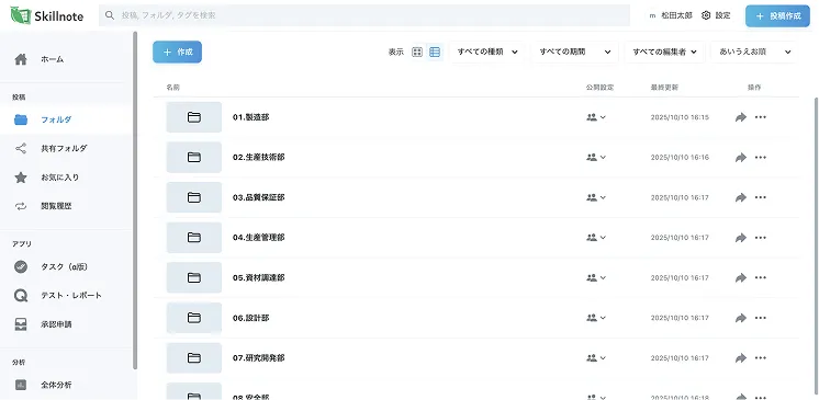 動画マニュアルに加え、PDF等のファイルも権限付きフォルダで一元管理。更新時に担当者→主任→課長のような承認フローも設定可能。